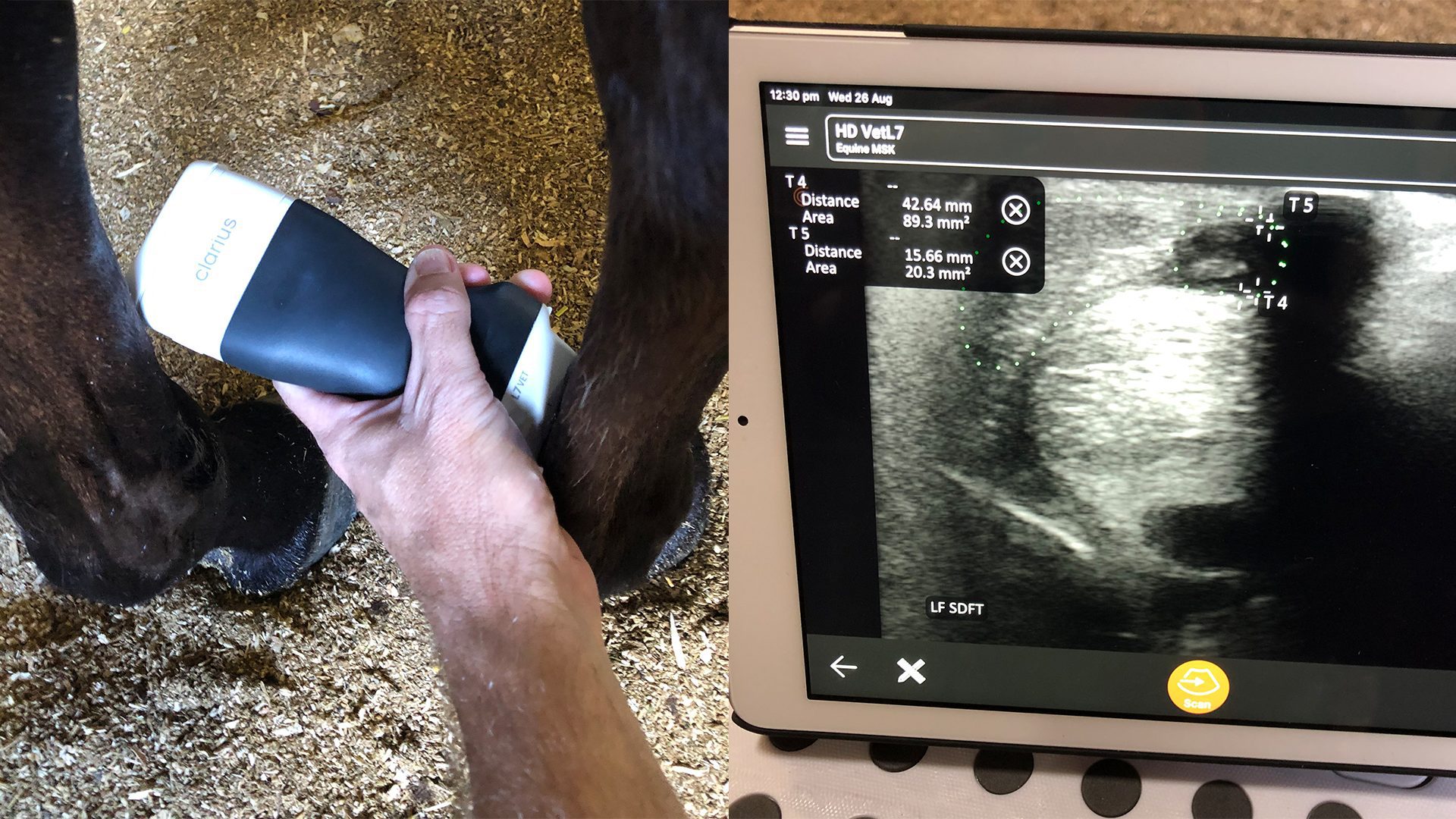 “Following is an ultrasound exam video captured with my Clarius L7 Vet on a three-year old thoroughbred racehorse. Here we see a lesion with another edge lesion. We start at the top of our lesion and then we’re just moving nice and smooth down the leg, identifying where our lesion is, getting a gauge of what’s going on. This is my preliminary scan, I’m working out where everything is, going down to the bottom our lesion. Now we know what we’re dealing with, we’re going to go back and then we’re going to take our regular intervals, document our images, and then get our measurements.