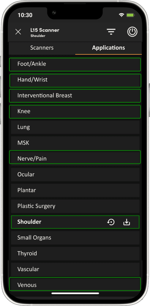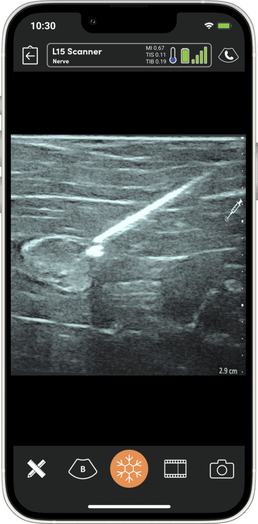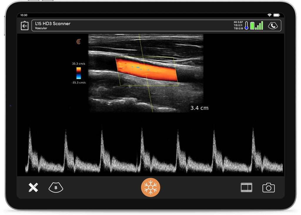Gardez les mains libres en demandant à votre échographe de se figer, de régler la profondeur et le gain, de capturer des images et d’enregistrer des vidéos, et bien plus encore !