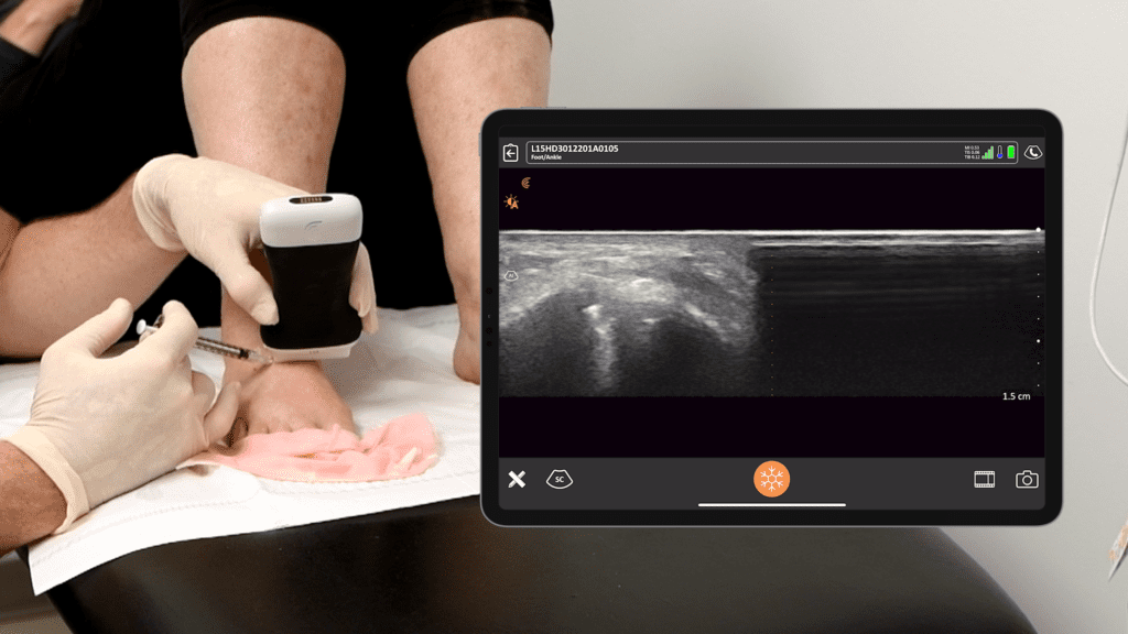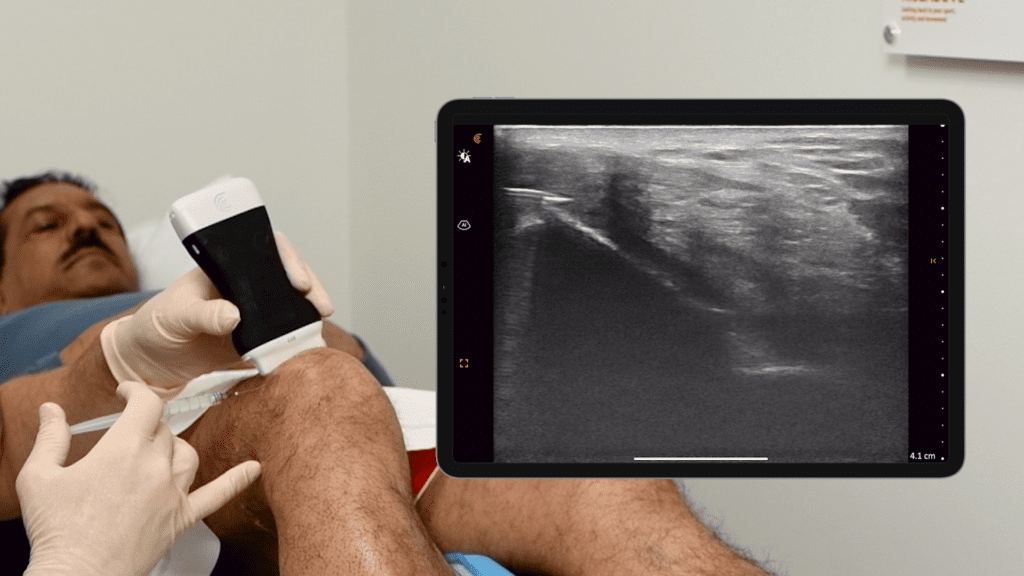 Identifying the suprapatellar recess is easily achievable with high-resolution ultrasound, even when there is very little fluid to target. In this video Dr. Johnson locates a small amount of fluid in the space, then guides his injection and watches it flow into the joint.