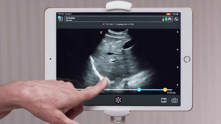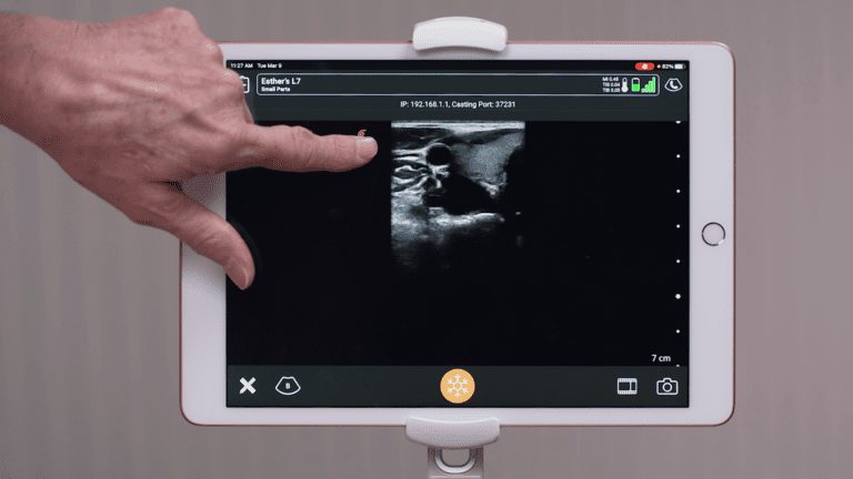 Once the snowflake is pressed to freeze an image the image can be store by pressing the camera icon, bottom right of the scanning screen. You can also use the “button up” to store an image (raised arrow on the scanner nearest the battery).