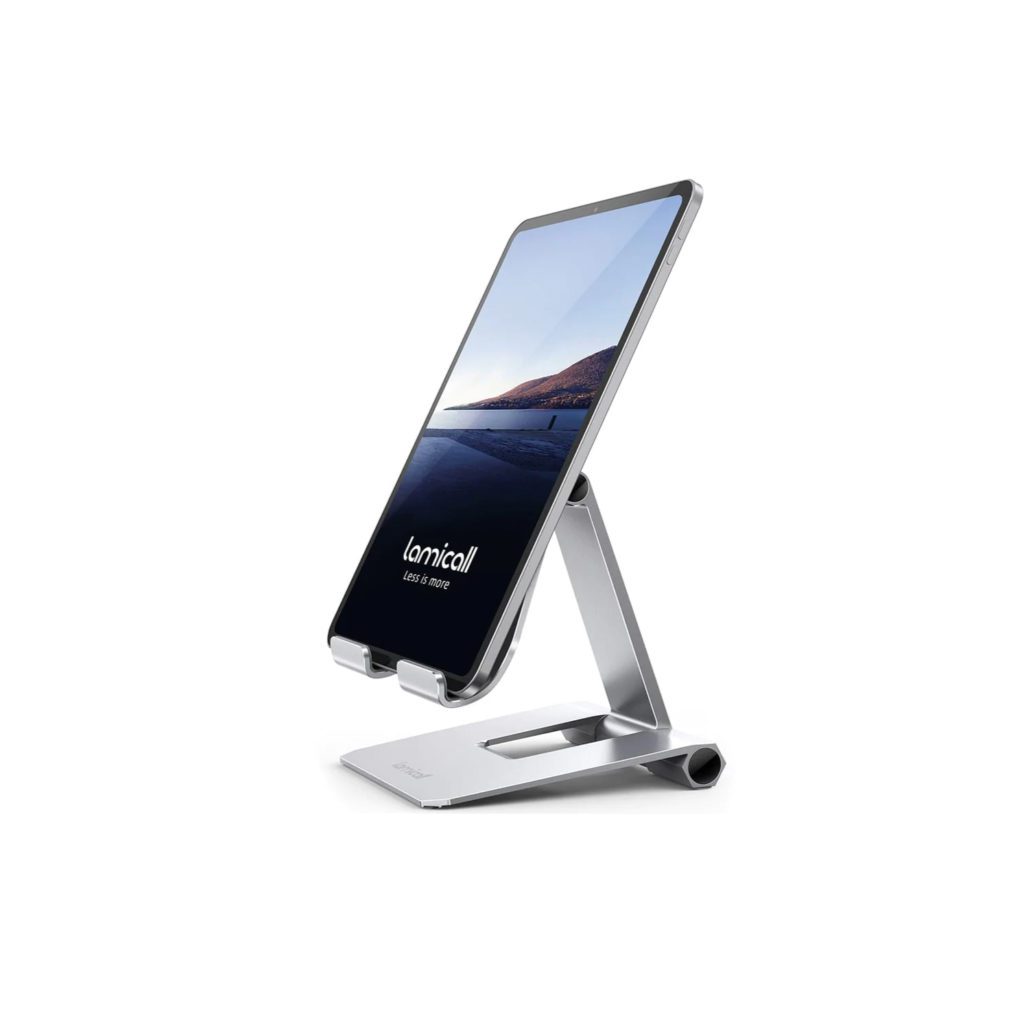 For something that will rest on a table, we recommend the Lamicall Adjustable Tablet Stand.